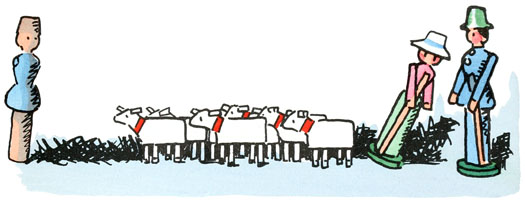 Les soldats obéirent et Quillembois tomba en plein dans la bergerie: à quelques rondelles de lui, la bergère verte et rose gardait toujours ses moutons.