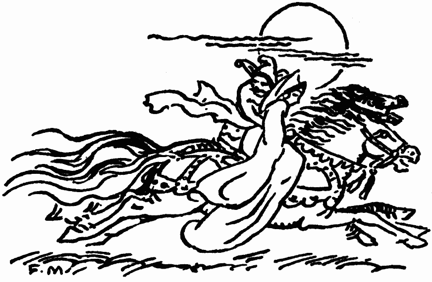 My fancy mingles in the past. It hears in the inn-yard the chattering pilgrims starting on their journey. Here is the Pardoner jesting with the merry Wife of Bath, with his finger on his lips to keep their scandal private. It sees Dick Turpin at the crossroads with loaded pistols in his boots. There is mist tonight on Bagshot Heath, and men in Kendal green are out. And fancy rebuilds a ruined castle, and lights the hospitable fires beneath its mighty caldrons. It hangs tapestry on its empty walls and, like a sounding trumpet, it summons up a gaudy company in ruff and velvet to tread the forgotten measures of the past.