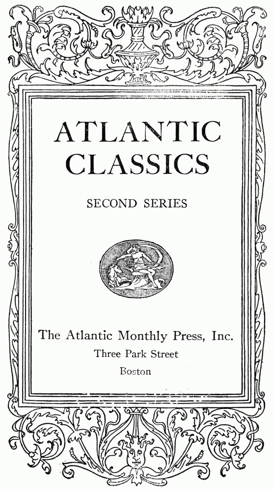 These matters belong most properly to the province of the schoolmaster. The editor's is a different purpose. It is not a text which he seeks to compile, but (forgive a layman's distinction) a book, a book to read, enjoy, and keep. To all who have found amusement and profit in the first series of Atlantic Classics, I think I can promise that here shall be found no lowering of the bars, but only the enlargement of interest which must come from such an influx of new company.