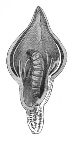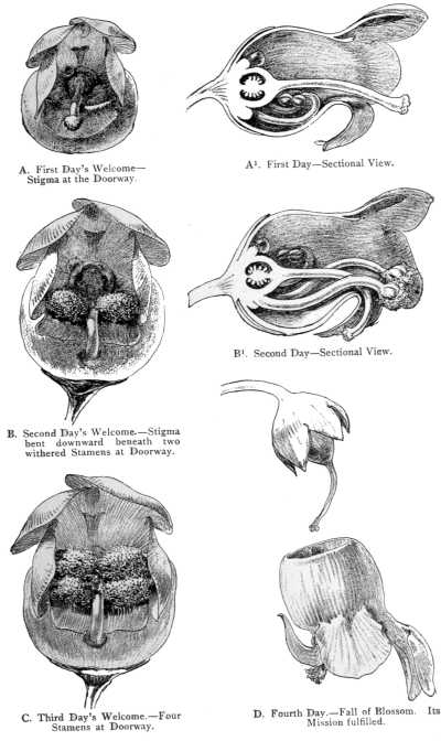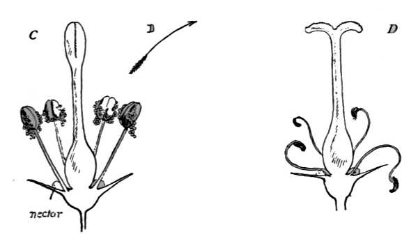 But now Sprengel himself was met with most discouraging opposition to his theory, showing that he had guessed but half the secret after all. Flowers by the hundreds were brought to his notice, like that shown in Diagram C, in which the insect could not transfer the pollen from anther to stigma, as the stigma is closed when the pollen is ripe, and like that in Diagram D, which does not open until the pollen is shed. For seventy years this astonishing fact puzzled the world, and was at last solved by the great Darwin, who showed that nearly all flowers shun their own pollen, and are so constructed, by thousands[208] of singular devices, that the insect shall bring to each the pollen of another flower of the same species, and thus effect what is known as cross-fertilization.