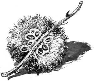 But such a swarm of locusts as we read of in Scripture, and frequently in the history of modern times and in our own country, would be comparatively tame and merely amusing affairs were they composed of our so-called "locust"—he of the whizzing timbrel in the sultry August noon. For this insect has no teeth, and could not bite a blade of grass if it wanted to. And herein we see one of the peculiarities which constitute him a "bug," and which also includes in the same company our woolly swarm upon the alder twigs. In place of teeth these insects are supplied with a beak for sucking the juices of plants. If we carefully examine the dense snowy mass we find it composed of small tufts closely crowded together, each tuft being borne upon the plump body of a small insect whose beak is deeply sunk into the tender bark.