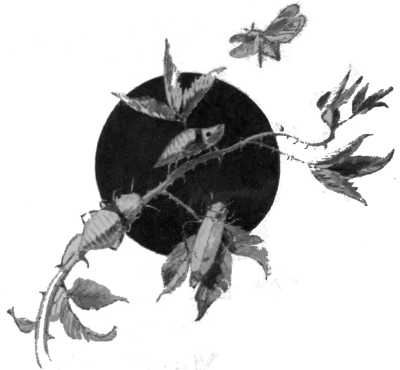 "These eggs thus inserted beneath the skin of the caterpillar," I explained, "soon hatched into minute white grubs, which immediately fastened themselves upon the tissues within the caterpillar's body, and he is now obliged to eat for the[243] whole family, which he continues to do without any outward signs of inconvenience or protest, which, of course, would be useless. I fancy he must have frequent attacks of that 'all-gone' feeling that we hear so much about in dyspeptic people, but if he does he gives no hint of it by his looks, as he devours one leaf after another along the stem, and displays his plump proportions with evident pride—like the whole tribe of horny-tailed 'sphinx' caterpillars to which he belongs.