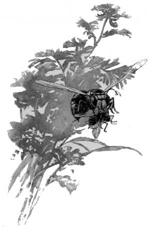 A sand bank of some sort is usually the terminus of this strange ride of the cicada. Thus far many curious observers have followed the two, and wondered what it was all about. If they had cared to follow the matter to the end, they would[252] doubtless have wondered still more at the strange fate which awaited the unlucky harvest-fly, whose last song had been his own requiem. The sand-hornet is also known as the "digger-wasp," the largest of its kind, the most formidable of all our hornets, and carrying within its black, yellow-spotted body a most searching and terrible poisoned sting. It was a common belief in ancient times that "seventeen pricks of a hornet" would "kill a man," to quote from Pliny; and there are many[253] country people to-day who would as quickly attack a rattlesnake as this big sand-hornet, and who "absolutely know" of men who have been "knocked down" and even "killed" by one stab of its sting. However this may be, it is well to keep at a respectful distance. When we know what the little yellow-jacket can do with its tiny dagger, and then reflect that this sand-hornet's javelin is about a third of an inch long, we can draw our own conclusions, and will readily understand why it was that our cicada's song was cut short. "But why didn't the hornet eat him on the spot? Why should it fly away with him and yank him about so unmercifully?" This is a common question with those who have observed the episode above described. A visit to the sand bank would have explained the object of it all. The exposed surface is seen to be perforated here and there with holes as large as one's little finger, while from one of them an occasional tiny stream of sand pours out, and we catch a glimpse of the horny, spiked legs of the digger-wasp within. Even as we observe him closely a loud hum is heard, and a filmy, buzzing object falls precipitately upon the bank, and in the jumble of wings and black bodies we now distinguish our hornet and cicada, which only a moment before had started from the edge of the shed roof above. The cicada is apparently dead, and is now an easy prey as the[254] wasp lugs him to the mouth of one of the burrows, and soon disappears in its depths.