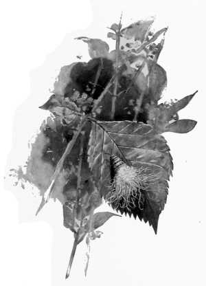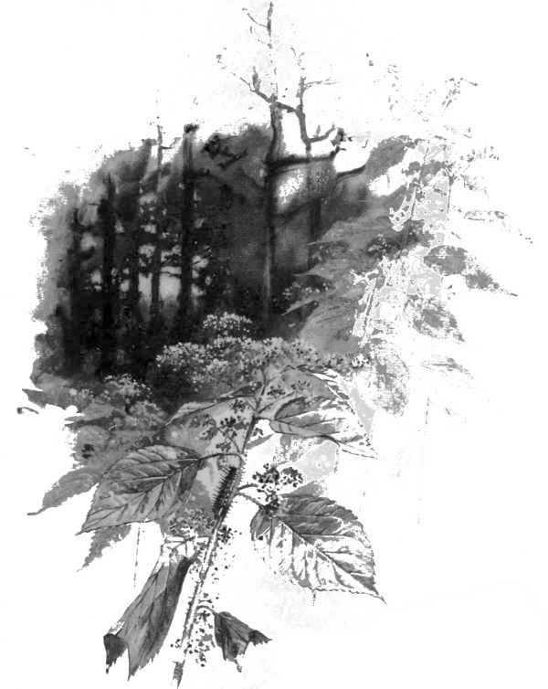 Half across the meadow I now observed that he held a leaf in his outstretched hand, and now I clearly noted that it was a compound leaf, and in another second I knew it all. For was it not a leaf of the Virginia-creeper or woodbine? and[241] how many before him have marvelled at that strange exhibition among the woodbine leaves which had now probably met his eyes for the first time? In another moment he was at the piazza stoop, and now he appears at the studio door. Eager anticipation and shortness of breath were equally manifest as he approached my easel and, with his right hand still outstretched towards me, exclaimed, "Well, what ails him?" at the same time laying down before me the mysterious specimen. It was a leaf of the woodbine, bearing along its stem a cylindrical mass of what appeared to be tiny, oblong, white eggs, all set on end, and so densely packed that but for the head and tail of the shrunken, green caterpillar which appeared at the two extremities of the mass no one would have guessed their origin. "What ails him?"