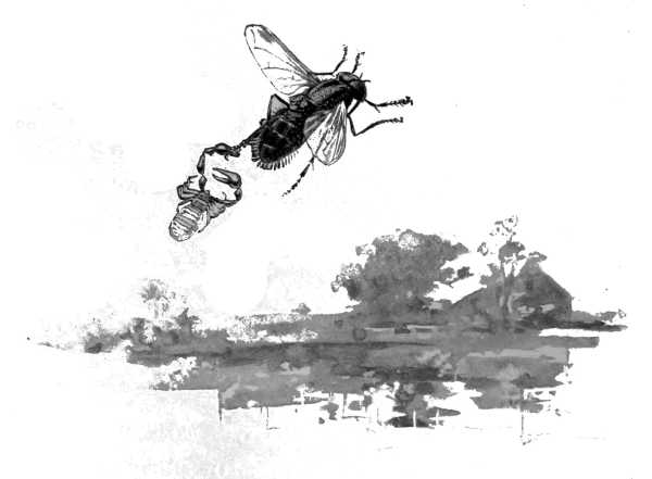 The method by which the sound is produced may be illustrated by a simple experiment. Take a small piece of stiff, sized writing-paper or smooth Manilla paper, and by pressure with some rounded blunt instrument produce a slight hollow or[249] blister upon its surface. Upon pressure from either side this blister will be found to "snap," and could we but repeat the operation with great rapidity, a continuous sound would result. The toy called the "telegraph ticker" is made on this principle, the blister being made on a strip of steel, and the click produced by pressure upon its top, the elasticity of the metal bringing it back to its original position of rest, and each motion accompanied by a snap as the blister changes sides. Indeed, we need look no further than the bottom of almost any well-ordered tin pan for a complete illustration of this principle. So our cicada is a drummer, and his favorite tune is a "roll-call," the beats following each other with such rapidity as to form a tone. All through the summer we hear his strain. Even at this moment, as I write, a very long-winded specimen is tuning up in the tree just outside my studio window, and I am almost moved to give him some good advice. Have a care, my noisy minstrel. If it were I alone who were within ear-shot of your noise all might be well with you, but there are others near by to whom your music hath charms. Have a care! Only a moment ago I heard an ominous hum on my piazza, and upon investigation discovered a huge sand-hornet prying about the premises. He knows what he is looking for, and so ought you, if your parents have done their duty[250] by you. Hereditary instinct at least ought to teach you that your drum should play second fiddle to that hornet's humming music. I remember once being the witness of the sad fate of an ancestor of yours who drummed not wisely but too well. He was monopolizing the neighborhood, just as you are doing now, when I noticed his principal effort was suddenly cut short in the middle in a most unusual manner. If he had been a singer I would have supposed some rival had clapped a hand over his mouth, so suddenly was the song abbreviated. In another moment there was a rustling among the leaves, as something fell from the tree in his immediate neighborhood. Down, down it dropped, its passage to the ground accompanied by one or two short, sharp, spasmodic tattoos on that same noisy drum. The object fell among some rocks, but before I could reach the spot the humming sound of a sand-hornet greeted my ears, and in a moment more the insect took flight directly across my path, and, what was more, he was not alone. Would you know who accompanied him? Look then on the picture on page 252, and have a care, my noisy friend, for the lineal descendant of that sand-hornet now hovers outside my doorway. He has a grudge against your tribe, and he is even now on your scent. Perhaps you may be interested to know what the hornet did with that[251] rash ancestor of yours. Well, I will tell you, for your own good. Guided by his noisy demonstration, the hornet spied him on his twig, and in a second had pounced upon him and, like a highwayman, stabbed him to the heart with a poisoned javelin. This cut short his song, as you may well suppose, and he fell in the grasp of his assailant. In another moment the hornet got a fresh hold upon him, and though your ancestor, like yourself, was much bigger than the hornet, those powerful, buzzing wings made an easy burden of him for quite a distance across the meadow. Here our captor took a rest, and after tugging that helpless cicada some distance up a high fence-rail, started off on another flight, which was brought to an end in the grass at the foot of a tree. In a moment more the hornet was seen tugging its huge load up the trunk. When some ten feet in height a third flight was made, this time gradually settling down on the roof of a shed down-hill. Tugging his game to the edge of the shed roof, a fourth trip was made, and this landed the two in the neighborhood of a sand bank at the roadside in the valley below.
