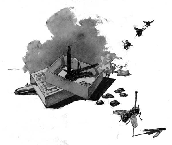 When the "Quaker" locust was captured it showed not the slightest sign of any such goings-on within its being. The final voracity of the larvæ was swift and terrible. And what an astonishing instinct is that which should teach these parasites to avoid the vitals of their insect host until the last moments of their own final, complete growth! The entire space of time from the activity of the grasshopper to the empty, transparent phantom was less than thirty minutes. I placed the unfortunate victim in a small, close box. Next morning he presented nothing but a clean, glassy shell, now more glassy than before, empty of every vestige of organic matter, while [200]scattered about on the bottom of the box lay fifteen dark red, egg-shaped chrysalides of the escaped larvæ. Two weeks later, upon opening the box, a swarm of flies flew out. I was enabled to keep two of them. They were almost exactly like the common house-fly to the ordinary observer, but belonged to a distinct genus. At this writing, in the absence of my specimen, I cannot give the name by which they are known in learned circles, but I think I am safe in saying that they probably belong to the group called Tachina, a family of parasitic flies which spend their early lives in a similar questionable manner, to the probable discomfort of potato-bugs, caterpillars, and other accommodating insect hosts.