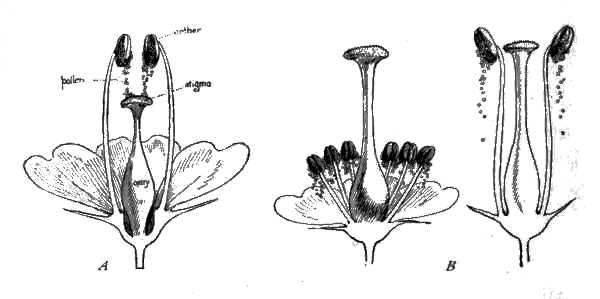 We all know, or should know, that the anther in flowers secretes and releases the pollen. For years even the utility of this pollen was a mystery. Not until the year 1682 was its purpose guessed, when Nehemias Grew, an English botanist, discovered that unless its grains reached the stigma in the flower no seed would be produced (Diagram A). But the people refused to believe[206] this, and it was not until fifty years later that Grew's statement was fully accepted, and then only because the great Linnæus assured the world that it was true. But about fifty years later another botanist in Germany, Sprengel, made the discovery that the flower could not be fertilized as these botanists had claimed, that in many blossoms the pollen could not fall on the stigma.