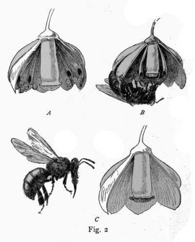 Sprengel knew that this pollen must reach the stigma, but showed that in most flowers it could not do so by itself. He saw that insects were always working in the flowers, and that their hairy bodies were generally covered with pollen, and in this way pollen grains were continually carried to the stigma, as they could easily be in these two blossoms shown at Diagram B. Sprengel then announced to the world his theory—the dawn of discovery, the beginning of[207] the solution of all these floral riddles. The insect explained it all. The bright colors and fragrance were intended to attract him, and the nectar to reward him, and while thus sipping he conveyed the pollen to the stigma and fertilized the flower.