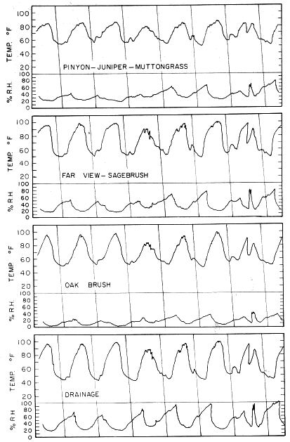 Within the trapping grid, the most moderate microenvironment, in terms of temperature and humidity, was in the pinyon-juniper [497] forest, where P. truei lives. The temperature extremes were wider in the microenvironments of a thicket of oak brush and of two different stands of sagebrush, where P. maniculatus lives, than in the forest. P. maniculatus tends to live in the harsher, more arid parts of Mesa Verde. Because of its propensity to build nests under things, or in the ground, and because of its ability to use less water per gram of body weight, P. maniculatus is better adapted to withstand harsh environments than is P. truei.