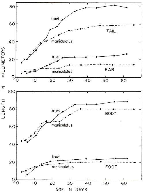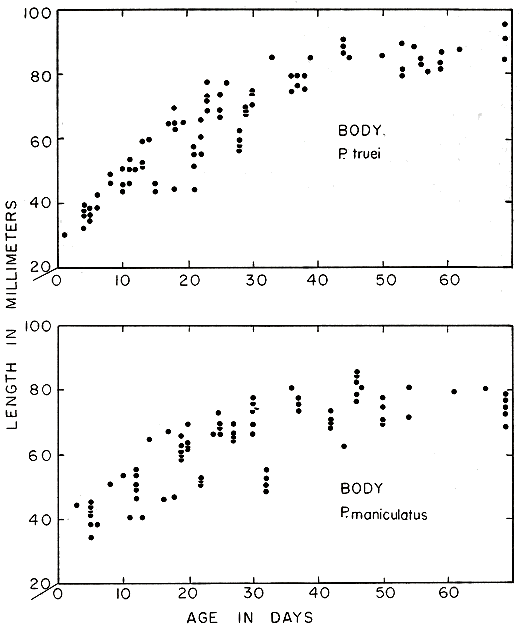 The length of time females must care for their young influences the rate at which individuals can be added to the population. Females of P. truei nurse their young longer and keep them in the nest longer than do females of P. maniculatus. Although this may enhance the chances of survival of young of P. truei, it also reduces the number of litters that each female can have in each breeding season. Females of P. maniculatus can produce more young per litter, and each female probably can produce more litters per year than females of P. truei.