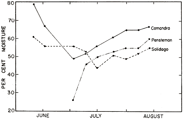 The graph in Figure 20 shows that Comandra contains the highest percentage of water through most of the summer. Water content of both Penstemon and Comandra was greatly reduced in the dry period that occurred in early July. Solidago maintained a relatively constant percentage of moisture; perhaps its woody stem serves for water storage. The rains of July and August increased the percentage of moisture in the plants, but not to the extent expected. Neither Solidago nor Comandra reached the levels of hydration of early June. All plants were collected at or about 11 A. M. At night, when mice are active, these plants would be expected to contain a higher percentage of water than in the daytime.