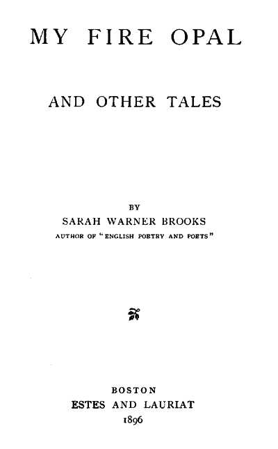 Project Gutenberg's My Fire Opal, and Other Tales, by Sarah Warner Brooks This eBook is for the use of anyone anywhere at no cost and with almost no restrictions whatsoever. You may copy it, give it away or re-use it under the terms of the Project Gutenberg License included with this eBook or online at www.gutenberg.org Title: My Fire Opal, and Other Tales Author: Sarah Warner Brooks Release Date: May 27, 2012 [EBook #39815] Language: English Character set encoding: ISO-8859-1 *** START OF THIS PROJECT GUTENBERG EBOOK MY FIRE OPAL, AND OTHER TALES *** Produced by sp1nd, Mebyon, Matthew Wheaton and the Online Distributed Proofreading Team at http://www.pgdp.net