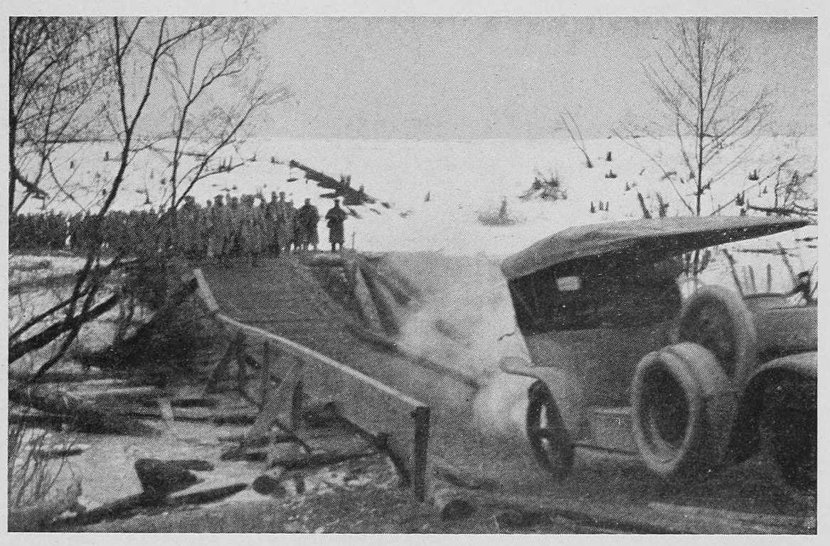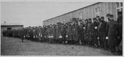 By[3] this time the big boat had been made fast to a long railroad pier and as we crossed the gang plank we made out in the bluish haze of an arc lamp, a line of soldiers who seemed to be herding the passengers into what appeared to be a long wooden shed newly built. Crowds are the same the world over, so no one held back, all pushing, luggage and passports in hand, into the frame structure built, I realized, for purposes of military inspection.