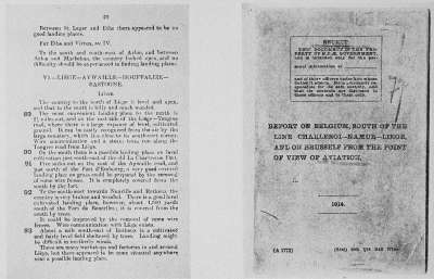 Opening his book, until he finds the index number 92 he reads that "To the southwest towards Neuville and Rotheux the country is very broken and wooded. There is a good level cultivated landing place, however, about 1500 yards south of the Fort de Boucelles.... Where communication with Liége exists." To use this map a British aviator flying over the section south of the line Charleroi, Namur, Liége and Brussels, would see what point he was over and would then look it up by the index number on the map and in the book he would read whether it was wise to make a landing there and just what conditions he would meet.