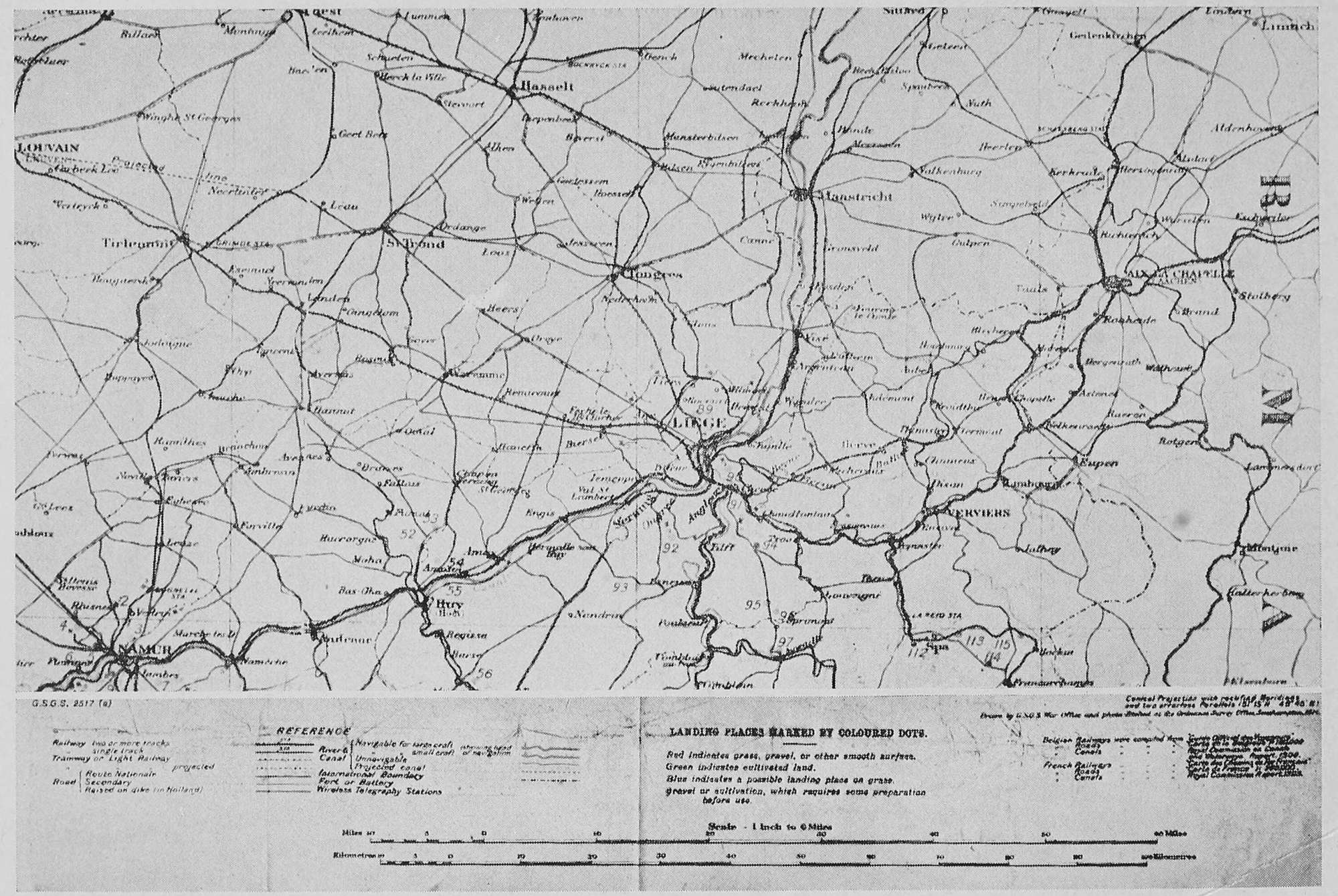 In Volume IV which gave all military routes for Belgium north and east of the line Brussels, Nivels, Namur, Liége, Vise, I read on page 13 that the reference maps dealing with the section "Brussels-Louvain" were those of the Belgian General Staff of a scale 1/40,000 but that sheets 31 and 31 of the English War Office were also available. Those English sheets were based on a reconnoiter of the entire district made in 1913 by the English. But more significant is it that English officers were referred to the 1/40,000 scale maps of the Belgian staff,[317] which England obviously must at that time have had—as an asset of preparedness.
