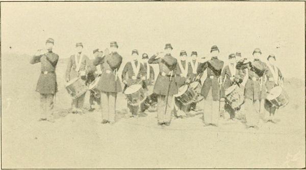 A full regimental drum corps was soon organized, and right here it may be proper to say that an old army drum corps in the sixties could make music. A boy would not “pass muster” in those days unless he could do the double and single drag with variations, execute the “long roll,” imitate the rattle of musketry, besides various other accomplishments with the sticks. And when a dozen or more of the lads, with their caps set saucily on the sides of their heads, led a regiment in a review with their get-out-of-the-way-Old-Dan-Tuckerish style of music, it made the men in the ranks step off as though they were bound for a Donnybrook fair or some other pleasure excursion.