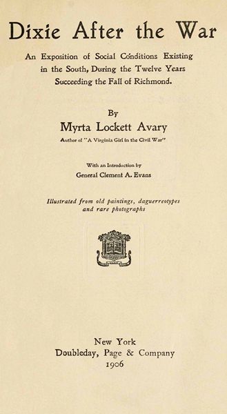 No book hitherto published portrays so fully and graphically the social conditions existing in the South for the twelve years following the fall of Richmond, none so vividly presents race problems. It is the kind of history a witness gives. The author received from observers and participants the larger part of the incidents and anecdotes which she employs. Those who lived during reconstruction are passing away so rapidly that data, unless gathered now, can never be had thus at first hand; every year increases the difficulty. Mrs. Avary’s experience as author, editor and journalist, her command of shorthand and her social connections have opened up opportunities not usually accessible to one person; added to this is the balance of sympathy which she is able to strike as a Southern woman who has sojourned much at the North. In these pages she renders a public service. She aids the American to better understanding of his country’s past and clearer concept of its present.