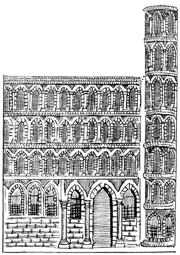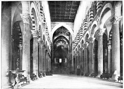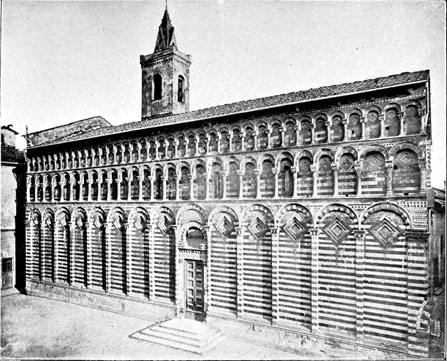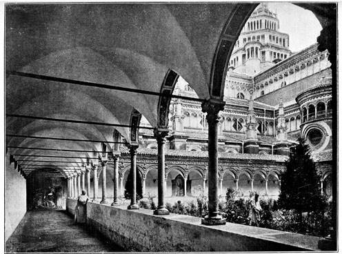 We shall see that all that was architecturally good in Italy during the dark centuries between 500 and 1200 A.D. was due to the Comacine Masters, or to their influence. To them can be traced the building of those fine Lombard Basilicas of S. Ambrogio at Milan, Theodolinda's church at Monza, S. Fedele at Como, San Michele at Pavia, and San Vitale at Ravenna; as well as the florid cathedrals of Pisa, Lucca, Milan, Arezzo, Brescia, etc. Their hand was in the grand Basilicas of S. Agnese, S. Lorenzo, S. Clemente, and others in Rome, and in the wondrous cloisters and aisles of Monreale and Palermo.