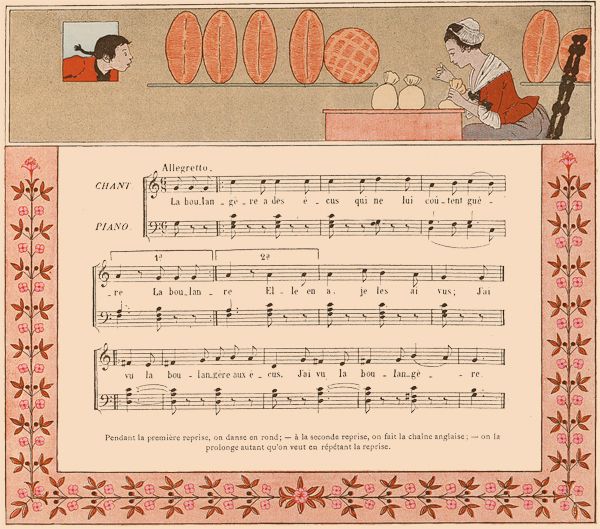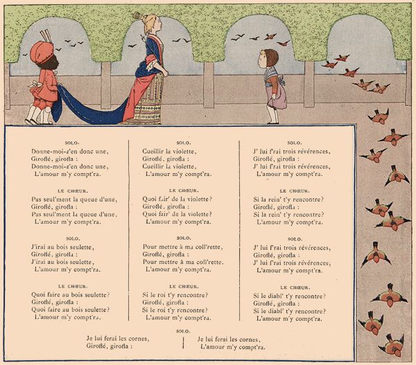 On fait une ronde. L'une des jeunes filles chante seule les deux premiers vers; au troisième, elle quitte la main de sa voisine de droite, et, se plaçant devant sa voisine de gauche, lui prend les deux mains; les autres enfants doivent passer en chantant le refrain sous l'arc qu'elles forment en tenant leurs bras élevés.