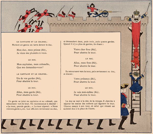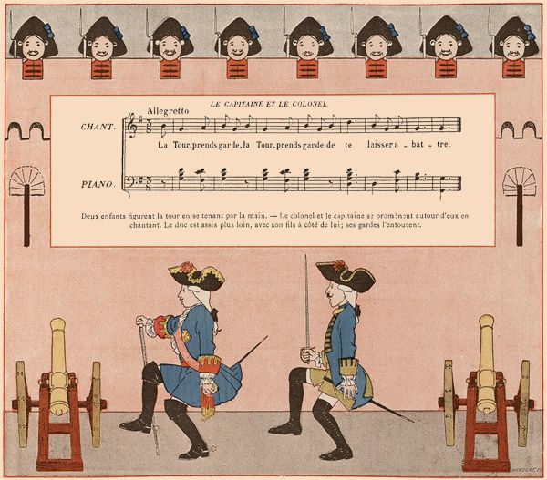 Deux enfants figurent la tour en se tenant par la main.—Le colonel et le capitaine se promènent autour d'eux en chantant. Le duc est assis plus loin, avec son fils à côté de lui; ses gardes l'entourent.