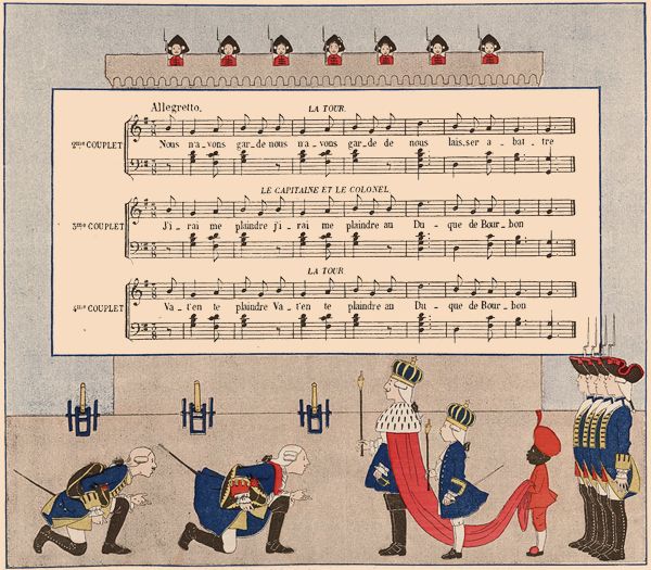 Un garde se joint au capitaine et au colonel, qui retournent vers la tour. On recommence à chanter: «La tour, prends garde...» La tour répond: «Nous n'avons garde», etc. Les officiers reviennent au duc, et demandent deux, puis trois, puis quatre gardes.