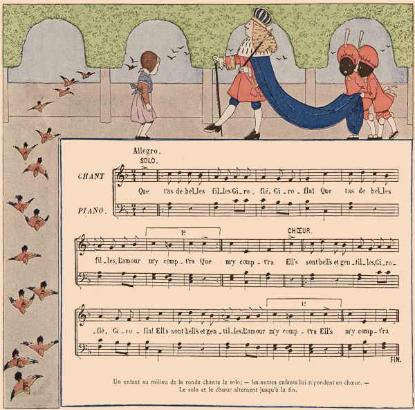 Un enfant au milieu de la ronde chante le solo;—les autres enfants lui répondent en chœur.—Le solo et le chœur alternent jusqu'à la fin.
