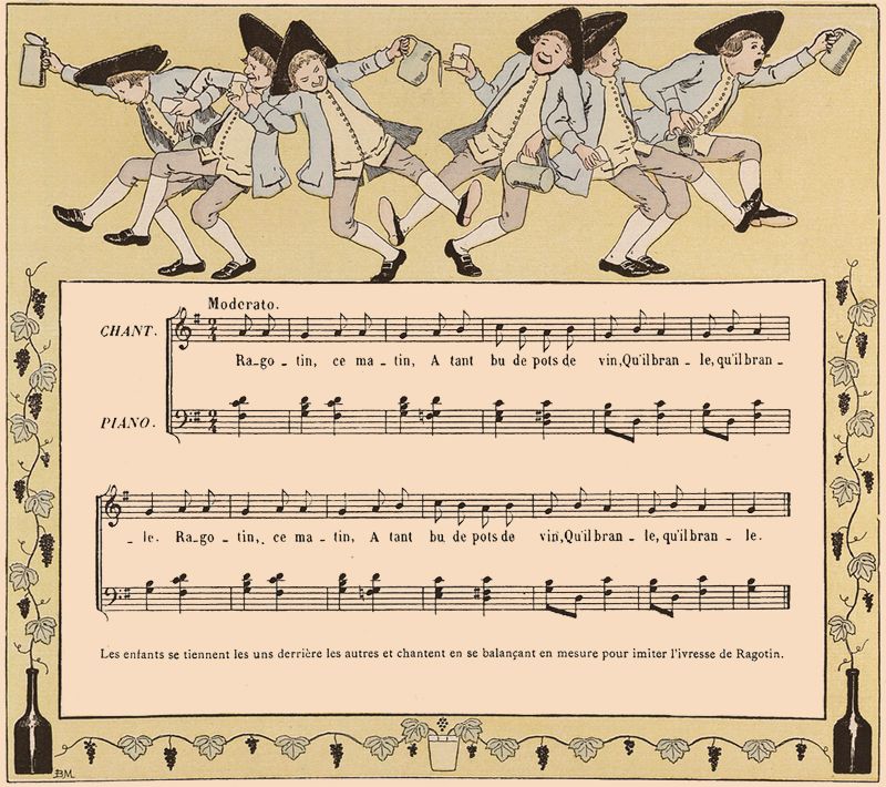 Les enfants se tiennent les uns derrière les autres et chantent en se balançant en mesure pour imiter l'ivresse de Ragotin.