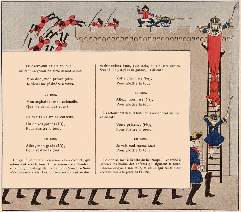 Le duc se met à la tête de la troupe. Il cherche à séparer les mains des enfants qui figurent la tour. Chacun essaye à son tour, et celui qui réussit est acclamé duc à la place de l'autre.