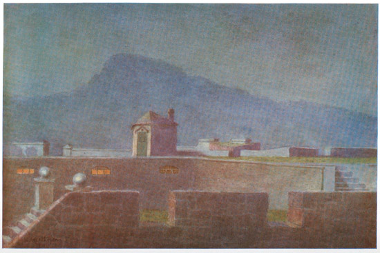 Under three purple-flowered trees standing in the Castle courtyard, one blazing hot morning, we, more sentimentally than travellingly inclined, sat and rested while a khaki-clothed Tommy wandered round to find a guide to show us over the old Dutch fort. We thanked Heaven for his half-heartedness and for some shade. Marinus, fortunately for us both, smoked his pipe of peace and of Transvaal tobacco, and I opened the Brass Bottle, which, indeed, is no bottle at all, but, as everyone not vulgarly inclined knows, a fairy-tale metaphor for one's imagination. The barometer registered 97° F. in the shade, which is a perfect state of atmosphere for the fumes of the Brass Bottle, in which, all mingling with the smoke from Marinus' pipe, the building of the Castle began.