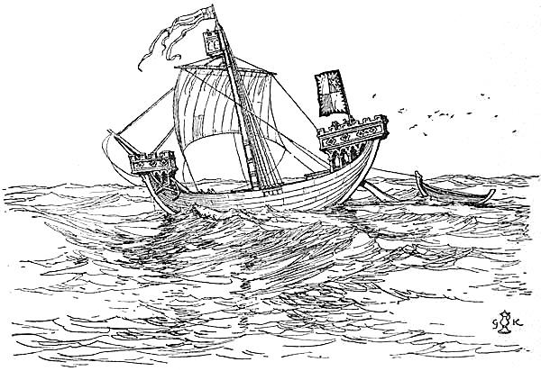 The hold of a ship, like poverty, makes strange bed-fellows acquaint. A hundred distaves, emblems of peaceful home-life, came into London port in 1390 side by side with ninety-three dozen swords, these latter for Gerard van Barle, who must have been either an armourer in business on a very large scale, or else an army contractor. Six hundred oranges, at fifteen a penny, we find sandwiched between eight barrels of varnish and nine glass cups; a jar of preserved dates is thrust in between twelve yards of linen cloth and a barrel containing seven and a half dozen beaver hats. A ship of Dieppe came into Winchelsea harbour in 1490 with damask and satin and pipes of wine, razors and needles and mantles of leopard skins, five gross of playing-cards and eight gross of latten ‘Agnus[Pg 162] Dei.’ These last, which I regret to say seem to have been considerably less valued than the ‘devil’s books’ which accompanied them, were plaques stamped with the figure of the holy Lamb, and it would seem that they were so common that the word became a synonym for a plaque, as in an inventory of the jewels of Henry VII. occurs ‘an Agnus of the Salutation of Our Lady.’ In the same way the component parts of the rosary became so intimately associated in men’s minds with prayers that when we read in a list of cargo of ‘pater-nosters’ or ‘bedys’ of amber, coral, tin, or ‘tree’ it is impossible to be sure whether they were rosaries or beads in the modern sense of ornaments. Devotional objects naturally figured largely in the imports of mediæval days, images of painted wood or tin occurring with frequency in the London customs[Pg 163] accounts of 1390, and the alabaster carvings for which England, and in particular Nottingham, was famous form quite the most interesting of our exports in the fifteenth century. As a whole it must be admitted that our exports at that time were very dull compared to our imports; cloth, hides, and corn are but uninspiring merchandise, and although the frequent mention of ale and beer might cheer the heart of Mr. Belloc or the late Mr. Calverley it leaves me cold. One item, however, is interesting in the fifteenth-century exports from Bristol, and that is the constant occurrence in cargoes for Ireland, and for nowhere else, of casks of ‘corrupt wine.’ This looks like ‘another injustice to Ireland.’ With this untempting liquor went a good quantity of honey, possibly to counteract its acidity, and of ‘battery-ware,’ which was really such things as kettles, but may have been endeared to the Irish from an imaginary connection with assault.