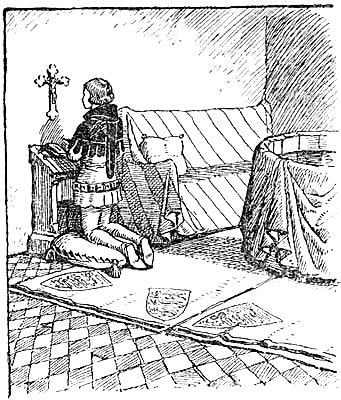 [Pg 76]The king, after his ride to Westminster Palace, partook of a light supper and retired to his chamber. If he had not already been knighted he prepared for that ceremony, a usual though not invariable preliminary to coronation, by keeping vigil. The room in which the young Edward III. rested was provided with red rugs with the royal arms worked in the corners, three ‘bankers’ or bench covers of a like design, and other ‘bankers’ of red, green, murrey and blue, and his bath was covered with silken cloth of gold, though for the bath of Henry VII. Flemish linen was considered good enough. On the morning of the coronation day the king, after the ceremonial bath, put on spotless raiment, to signify that ‘as his body glistens with the washing and the beauty of his vestments so may his soul shine,’ and went into Westminster Hall, where he was lifted by his lords into his throne. Presently the royal procession, the king walking barefoot[Pg 77] and the various nobles carrying the regalia, started down the covered way, carpeted with the coarse burrell cloth of Candlewykstrete (now Cannon Street), so much of this carpet as lay outside the church being the perquisite of the lord of the manor of Bedford as almoner for the day, and were met by the monks and clergy, and by them conducted into the Abbey. With the details of the ceremony that then ensued, ‘whereof the circumstaunce to shewe in ordre wolde aske a longe leysoure,’ all who are interested must by this time be well acquainted, so often and so fully has it been described.
