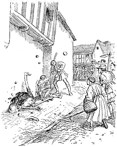Mediæval Englishmen seem to have a partiality for strange beasts, combined with a reluctance to pay exorbitant fees for seeing them. In 1364 Edward III. had to order the mayor and sheriffs of London to protect Roger Owery and John Want, to whom he had committed the custody of a certain Egyptian beast called an ‘Oure,’ various persons, who apparently wished to see the beast without paying, having threatened to assault them and kill the ‘Oure.’ What this creature was is not clear; possibly it was the aurochs or buffalo—Borde’s[Pg 172] ‘vengeable beast,’ the Bovy of Bohemia. Whatever it was its keepers, who had no doubt looked forward to making a good thing out of exhibiting it, seem to have had a doubtful bargain, and the same fate befell Thomas Charles, ‘squier,’ and William Lynde just about a century later when they obtained from the king the keeping of his ‘foul called an Estrich.’ They sent the ostrich round the country in charge of Richard Axsmith and John Piers, ‘for to disporte with the sight of hym the kynges true lieges,’—and incidentally, though they do not think that worth mentioning, to put money in their own pockets. ‘How be hit that oother mysdoers in certain places wher lite reverence is doon or shewed to anything of the kinges, as the dede hathe proven, have withoute cause wrongfully doon grete trespasses and offenses as wel to the said foul as to Richard Axsmyth and John Piers.’ At Royston a mob, egged on by the prior, assaulted the keepers and caused the ostrich ‘to ben seyn of alle peuple’ and the[Pg 173] unfortunate ‘fowle’ was ‘hurten so sore that he may never be hool, as hit on hym wel appereth.’ When they came to Norwich one of the sheriffs cast them into prison as ‘false Flemings,’ and ‘caused the foul to be seyn in the common strete of alle peuple that list to come seen hym for nought.’ Nor did they have any better luck at the next town, Bury St. Edmunds, where they were again imprisoned and the bird exhibited for nothing, the townsmen ‘axing hem who made hem so hardy as to go on with the kinges foule about among his peuple without a commission.’ This seems to have been the end of their tour in the eastern counties.