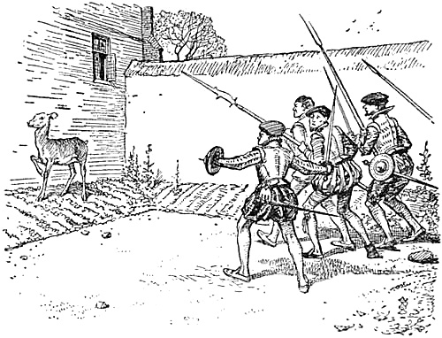 figure often enough in our old records, and often enough got their owners into trouble for[Pg 190] poaching, but they were not so frequently complained of for assault as might have been expected. I remember coming across one rather interesting case in which a man complained that a neighbour’s dogs had chased a tame deer belonging to his daughter, and when she interfered to rescue it had bitten her hands. The keeping of tame deer was common enough; Edward III. had a tame hind brought from St. Albans to Woodstock on one occasion, and about a couple of centuries later a Lincolnshire clergyman, John Barnardiston, rector of Great Coates, for his own recreation and comfort and the amusement of his friends, ‘norysched, kept and brought up a tame hynde calfe.’ Unfortunately he had annoyed Sir Christopher Askew, who instigated William Morecropp and other ‘lyght and evyll disposed persons’ to kill the hind. They discovered where it frequented day and night and carried it off to Morecropp’s house, where they assembled next day ‘with force and aryms; that is to saye wyth staves, bylles, swordes and[Pg 191] bokelers,’—an almost excessive armament for the purpose,—and slew the unfortunate hind and carried its body to Sir Christopher, who, when Barnardiston complained, ‘lyghtly and wantonly made a gret game and sport therat’ and threatened that worse should befall him if he did not sit still. While sympathising with the rector for the loss of his pet, it is difficult to deny that the assembly of half-a-dozen[Pg 192] ruffians fully armed with swords and bucklers to tackle one tame little fawn suggests the four-and-twenty tailors who set out to kill a snail, and is not without its ludicrous side.