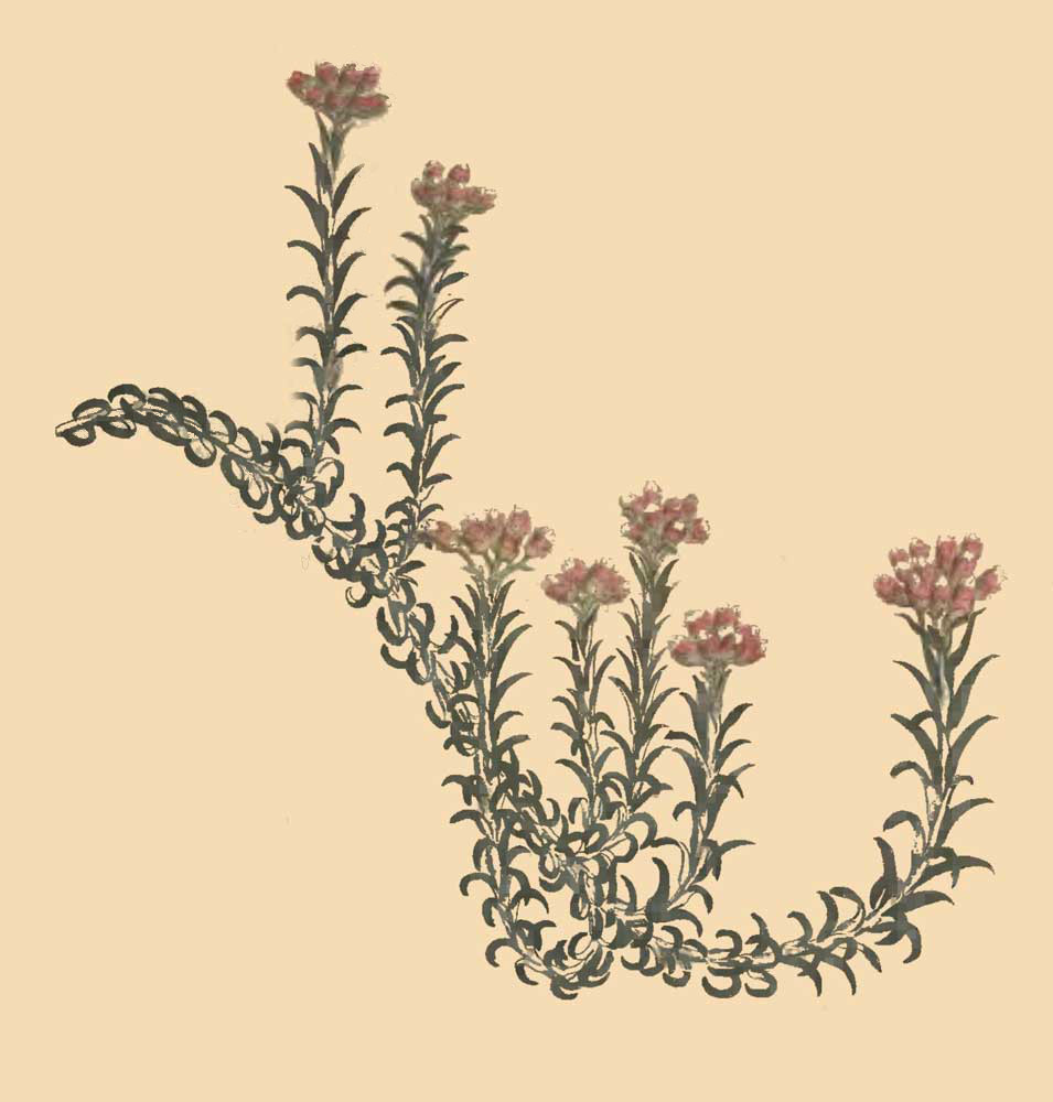 GNAPHALIUM ericoides fruticosum foliis sessilibus linearibus, calycibus exterioribus rudibus, interioribus incarnatis. Linn. Am. Acad. v. 6. p. 99. Syst. Vegetab. ed. 14. Murr. p. 746. Ait. Hort. Kew. p. 174.