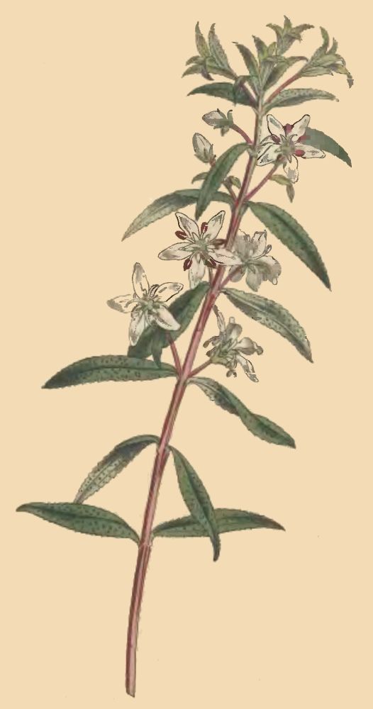 Descr. Twigs somewhat angular, reddish purple; Leaves opposite, narrow, on very short footstalks, spreading, slightly truncated at the extremity, finely toothed, a transparent gland in the angle of each tooth, beset on both sides with numerous glands, which project and give to the upper surface a manifest roughness; Flowers from the alæ of the leaves, opposite, on peduncles about one-third of an inch long, usually supporting one, sometimes two flowers; Calyx composed of five leaves which are tinged with red and permanent; Corolla five petals, white, ovato-lanceolate; Stamina filaments five, white, hairy, at first upright, afterwards bending back betwixt the petals; Antheræ before they open purple; Pollen yellow; Nectaries of two kinds, five white, springing up between each filament, and which may perhaps be considered as so many imperfect stamina, they are broader, much smoother, and about one-third of the length of the filaments, terminating in a transparent gland instead of an anthera; five green, forming a kind of calyx to the germen, from the top of which they spring, they consist of five roundish, fleshy, spreading, green leaves, edged with hairs; besides these, there is a glandular ring at the base of the germen; Style white, tapering, very hairy; Stigma simple; Flowers usually dropping off without ripening the seeds.
