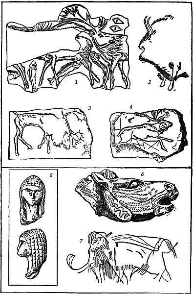 Carvings in Ivory (1 and 3–7) and in Stone of Cavern Walls (2), made by the Hunters of the Middle Stone Age