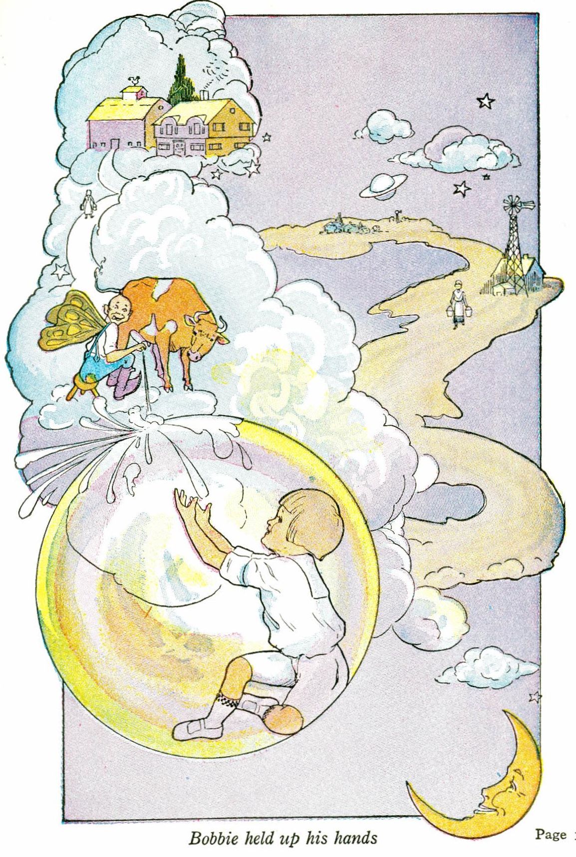 Bobbie grew more and more excited as he watched the grinning head with the long sandy beard rushing on and on. As it neared the Milky Way a flock of goats scurried wildly across its path and a herd of cows kicked up their heels and ran to the farthest corner of their pink pasture. And just then, with a fearful swoop, the Comet Express bore down upon Bobbie and the wonderful bubble.