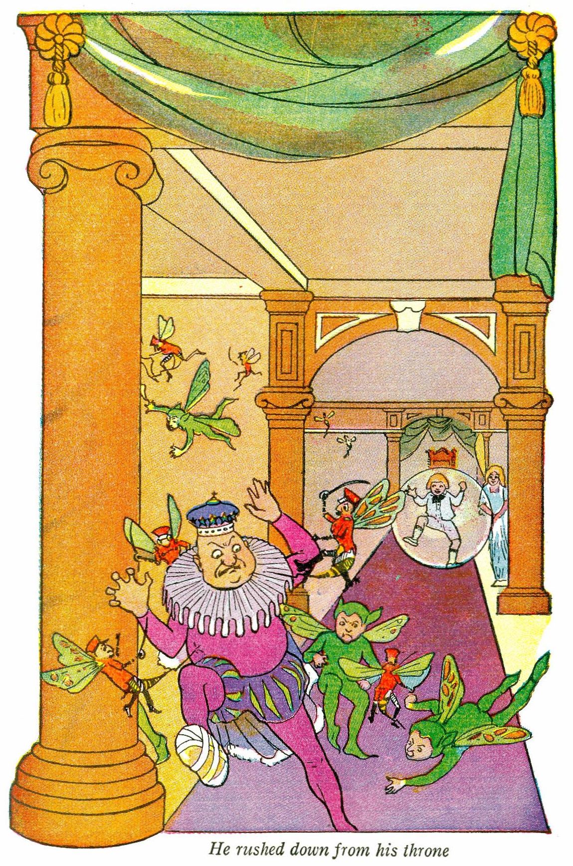 Now the King of Mars well knew the power of the fairies, and he usually listened to what they said; but it made him so angry to think he'd made such a mistake as to believe the fairy balloon a new world he shouted, “No! I'll not let him go! Put him under guard. Put 'em both under guard—put—” But before he could say another word, with a great buzzing and whirring, a whole host of fairy soldiers had fallen upon him. They stabbed the poor king right and left with their sharp little sabers and bayonets, so that he shrieked with pain and rage and—quite forgetting his bandaged foot—rushed down from his throne toward the door of the palace. Then the fairy soldiers fell upon the king's funny little admiral, and all the king's men, and drove them off helter skelter. The soldiers followed swiftly after them, and when they rushed past Bobbie, to his surprise he saw they were a swarm of bees!
