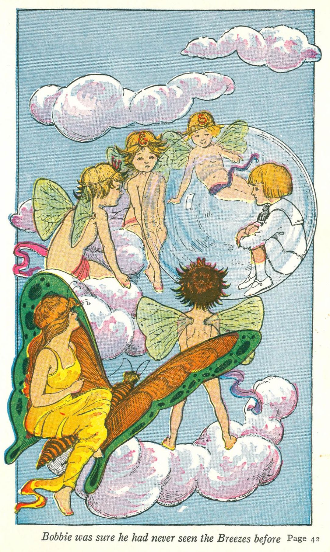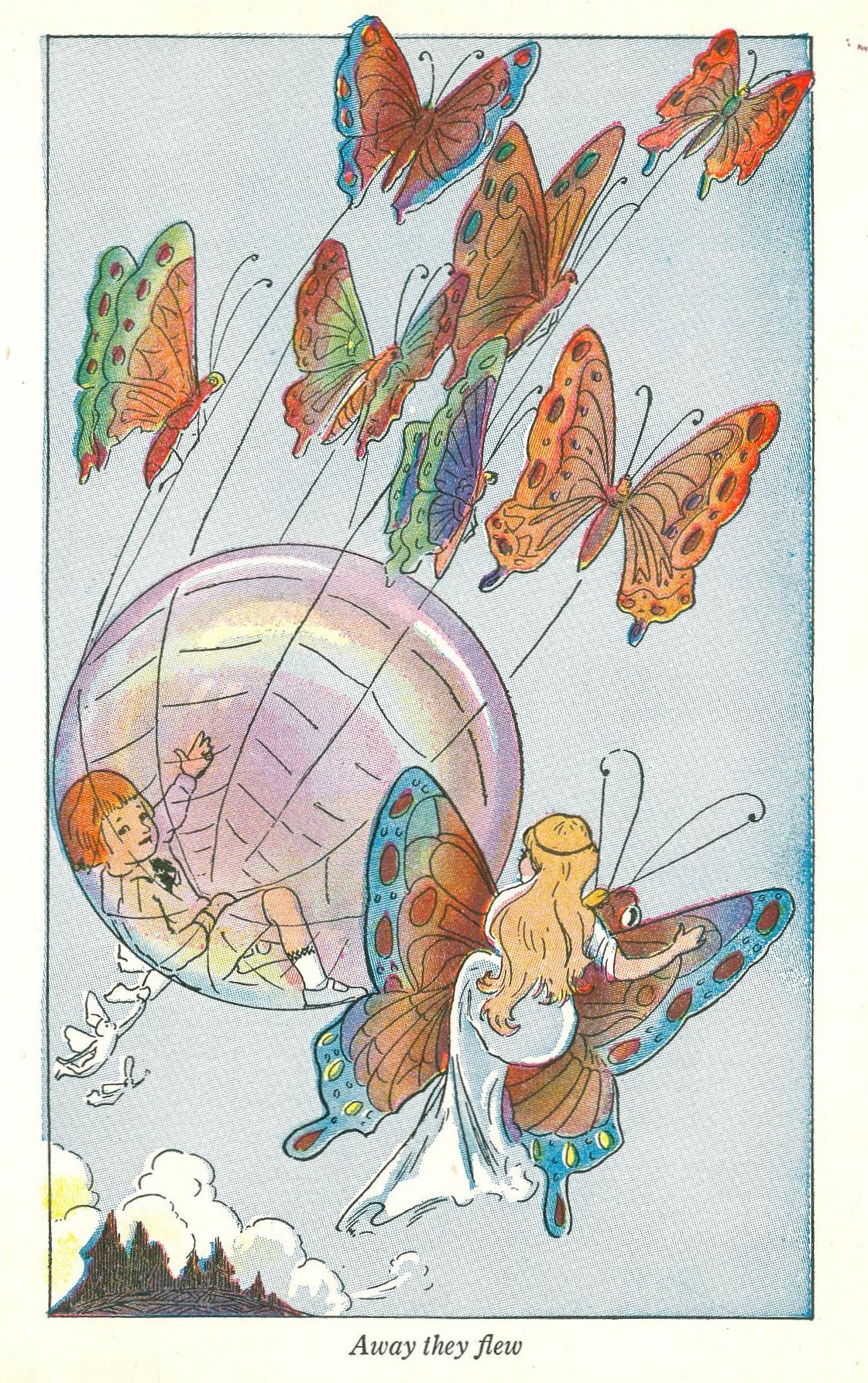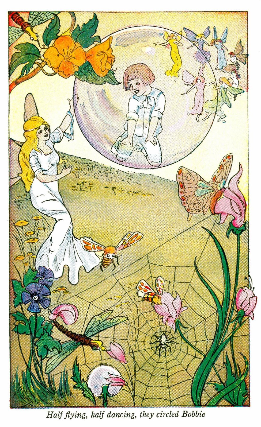 Back to the bower floated the bubble, and Bobbie slept until the sun was high in the morning sky. Then the fairy queen called him, and he awoke to see the Rainbow Fairies just outside. They were seated on brilliant butterflies which were harnessed to a spiderweb net.