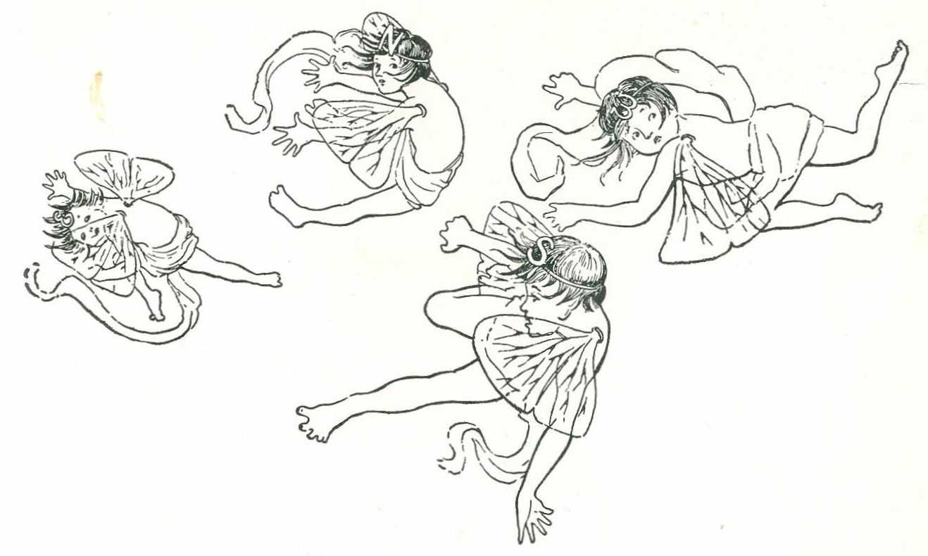 They hadn't gone very far when they met the four little Breezes frolicking in the air. They bobbed their heads up and down three times out of respect to the fairy queen, but all the time they were looking out of the corners of their eyes at Bobbie.