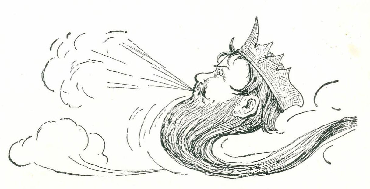 Bobbie began to be frightened. He didn't think he'd enjoy doing any such thing. He was wishing he'd never come with the Winds when he heard a great commotion behind him, and their father, old King Eolus himself, came puffing up.
