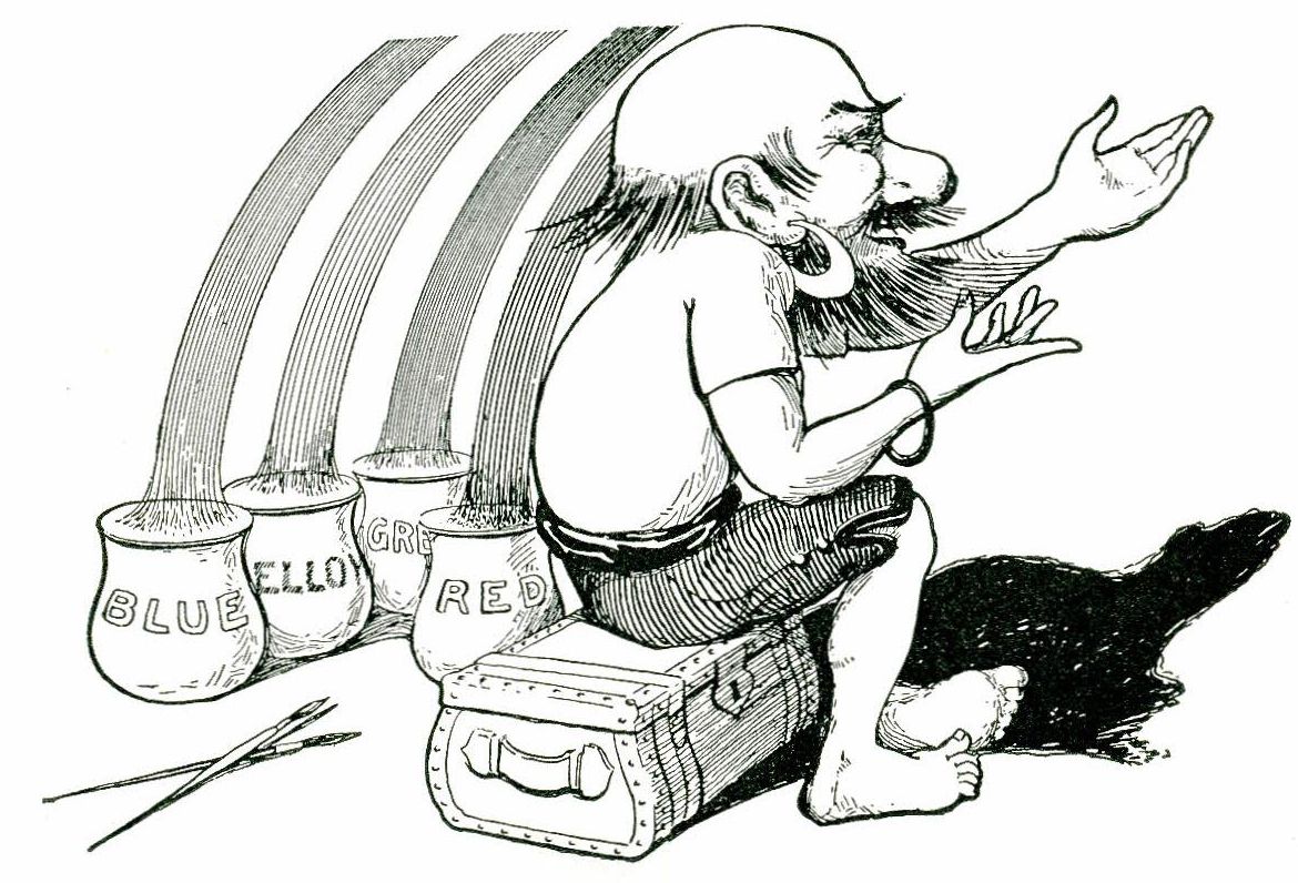 Then old King Eolus and Bobbie traveled on together until they came to a great shimmering many-colored arch. At the foot of the arch stood the Rainbow Dwarf beside the pot of gold, and piled around him were bags of coins and jewels, chests of silver, and wonderful jars and horns of precious metal. Their splendor dazzled one's eyes.