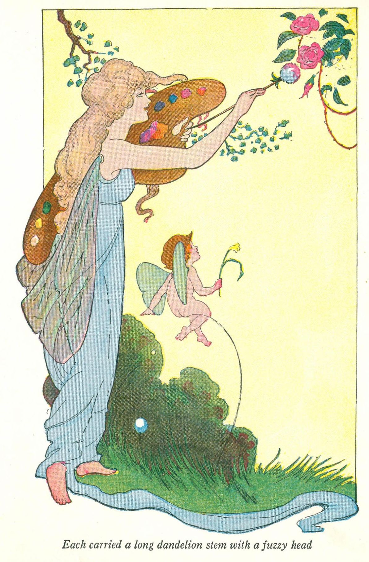 But the fairies seemed in a great hurry. Each carried a long dandelion stem with a fuzzy white head. One by one they went up to the rainbow, dipped the dandelion brush in gleaming color, and, in a second, were off again to Flowerland. The fairy queen told Bobbie of the new violets and buttercups, nodding sunflowers, and fields of new grass waiting to be painted by the Rainbow Fairies. Then she bade Bobbie good-by once more, and waving her hand to the dwarf, mounted her shining steed and flew swiftly away toward the golden sun.