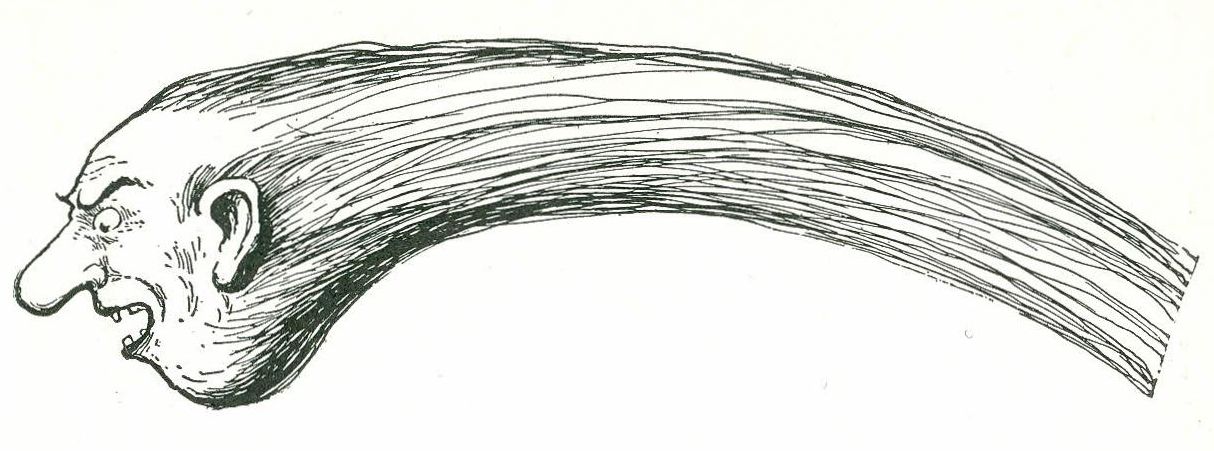 Imagine how shocked he was to see coming toward him a most remarkable person who was all head and no body—though at first glance the long sandy beard that trailed out behind him took the place of a body. But, indeed, he was no gentleman in any sense of the word. He had wicked looking eyes, and as he shouted again he pointed with one of his great ears.