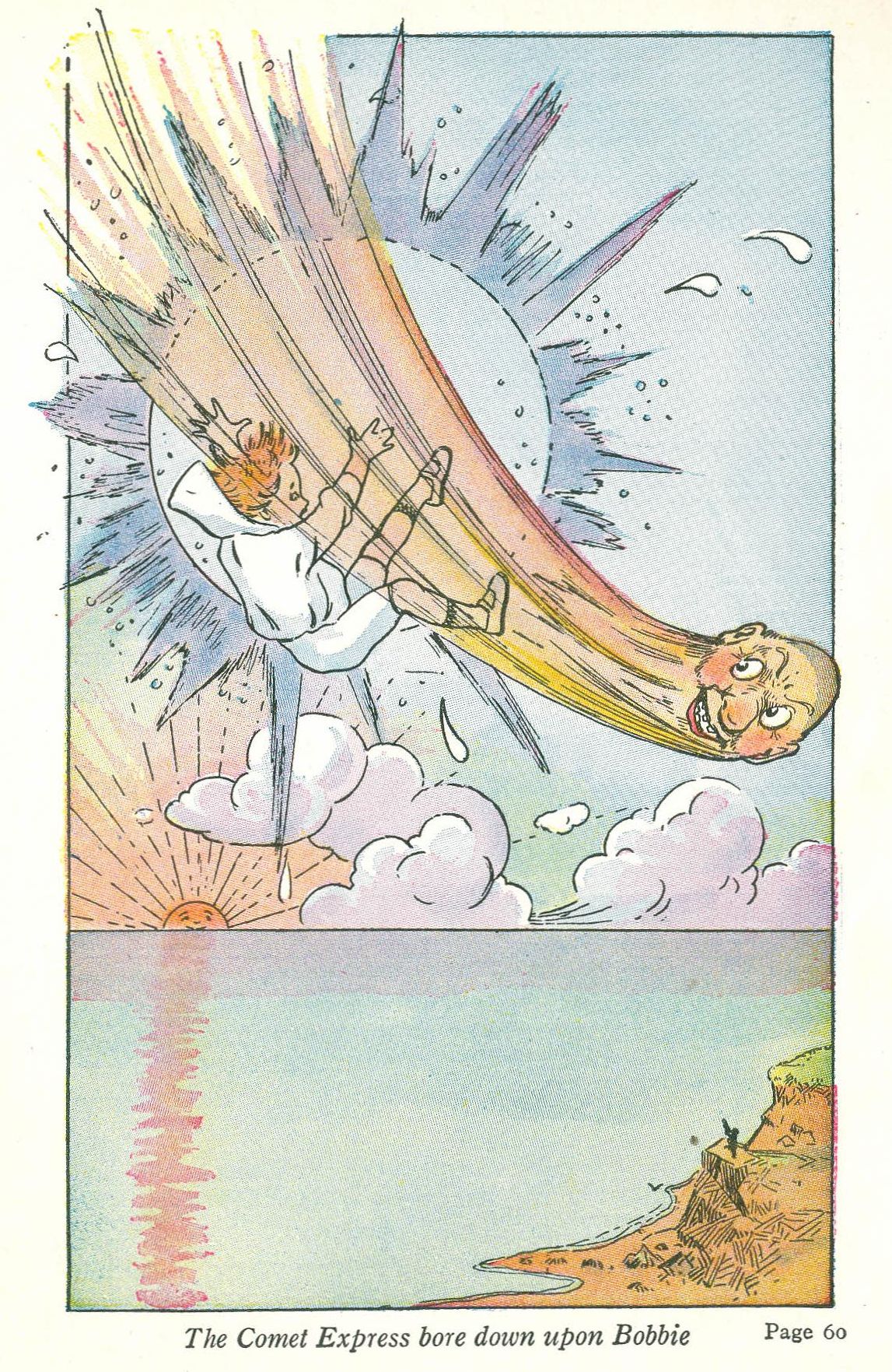 The bubble was splashing in a burst of water and light. The Comet Expressman looked back with an evil grin, and Bobbie went hurtling down—down—over and over—down—down. There below him was the big, deep sea. Down—down went Bobbie, and you may be sure he had no chance to think of any way to stop himself. Sometimes his head was where his heels ought to be, and sometimes he spun around like a top. And what was worse yet, once in a while, as he whirled about, he caught sight of the Comet Expressman, and that hideous head with the long sandy beard trailing out behind would wiggle its ears and grin.