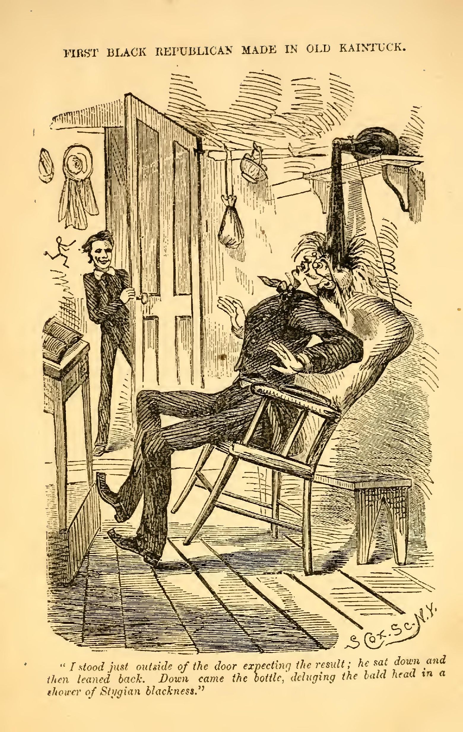 "It wasn't long till I worked out an idea. Just over the master's desk was a rude shelf, upon which he kept some books and a big-bellied bottle of ink, which some admirer of his Jeffersonian-Republican principles had presented him. I had observed that in stepping upon his desk platform, he never touched or moved his chair, beyond leaning back in it, which he always did, after taking his seat. So next day I robbed our old long-tailed white horse of a few hairs and braided them in a three stranded cord. While the master was gone out to his dinner, I put the thin glass ink bottle upon the edge of the shelf propped a-cant, and tied one end of the cord to the bottle, and the other end to the back of his chair. The boys sympathized with me, and were in an extacy of delight. Anon the master came. Without looking to the right or left, he marched sternly to the chair, and hence saw not the repressed titter of expectation that was ready to burst over the whole room. I stood just outside of the door expecting the result; he sat down and then leaned back. Down came the bottle, deluging the bald head in a shower of Stygian blackness! Yes, gentlemen, I fancy that was the first black Republican ever made in Kentuck, but the conversion was too sudden."