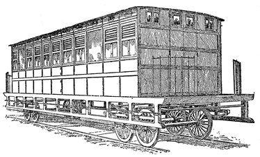 This first railway carriage for the transportation of passengers was aptly named the "Experiment." Consisting of the body of a stagecoach it accommodated approximately twenty-five passengers, of which number six found accommodations within, while the others perched on the exterior and the roof of the vehicle. The fare for the trip was one shilling, and each passenger was permitted to carry fourteen pounds of baggage.
