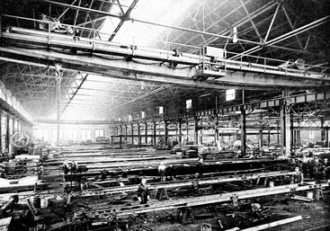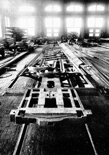 But fascinating as unquestionably was the work of the patient artisans who inlaid the beflowered Eastlake Pullman or the Moorish cars of another day, there is equal romance in the product of the modern worker who builds these rolling hostelries of steel. Under the high glass roof the tumult of ponderous machines fills the air with pandemonium. At one side of one of the main aisles a half dozen great steel girders, like keels for giant ships, lie on the floor. These are the mighty box girders, eighty-one feet in length and weighing over nine tons each, which will form the backbone of future Pullmans. To each of these girders, or sills, are riveted plates, angles, and steel castings which extend the full length of the car and platforms, as well as floor beams, cross bearers, bolsters, and end sills of pressed steel. On this foundation the side sills are riveted, steel beams that run the entire length of the car.