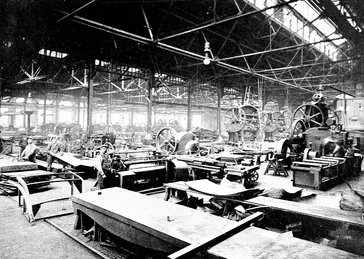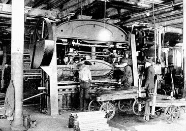 This great power press is engaged in shaping the steel panelling for the inside finish of the car