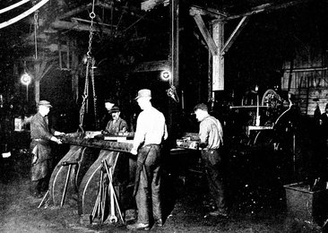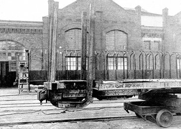 For a number of years steel sills and under frames had furnished a staunch foundation for all cars manufactured by the Pullman Company for its operation. Further strengthened by steel vestibules, it is to be doubted if the all-steel car offered any very material increase in the safety already afforded to the passengers. But the change which the steel car brought in the process of manufacture was radical in the extreme. The first Pullman cars, and in fact every car up to and through the nineties, was of all-wood construction. Wood-making machinery filled the great shops at Pullman; carpenters and cabinet-makers numbered a big percentage of the pay roll. It was a wood-working industry. At one fell stroke the old order changed to the new. The songs of the band-saw and the planer were stilled and in their stead rose the metallic clamor of steam hammer and turret lathe, and the endless staccato reverberation of an army of riveters. Ponderous machines to bend, twist, or cut a bar or sheet of steel filled the vast workrooms. An army of steel workers, Titans of the past reborn to fulfill a modern destiny, fanned the flames in their furnaces and released the leash of sand blast, air hose, and gas flame.